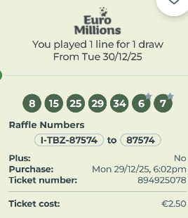 Euromillion Syndicate DP2 draw 30Dec25 cupons: