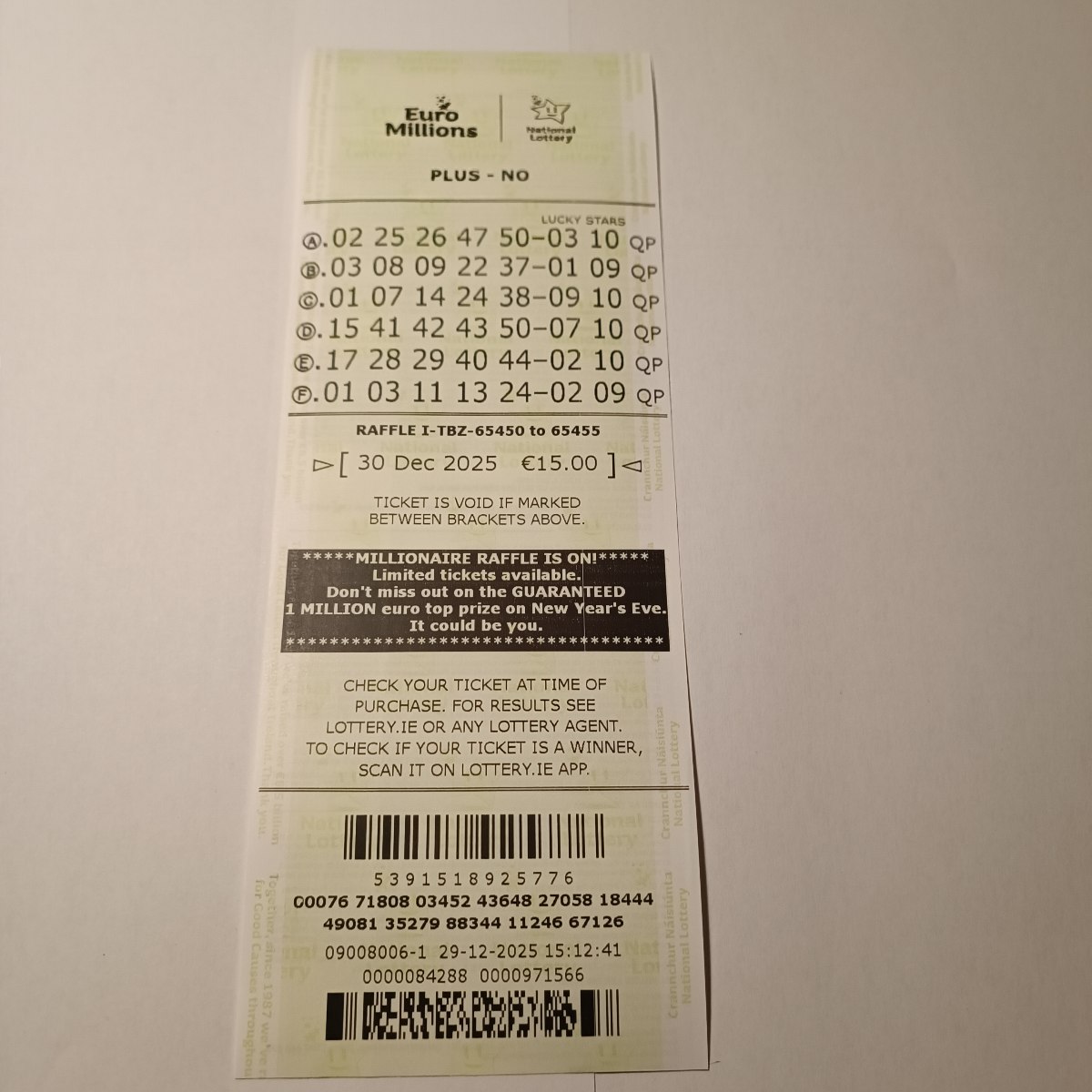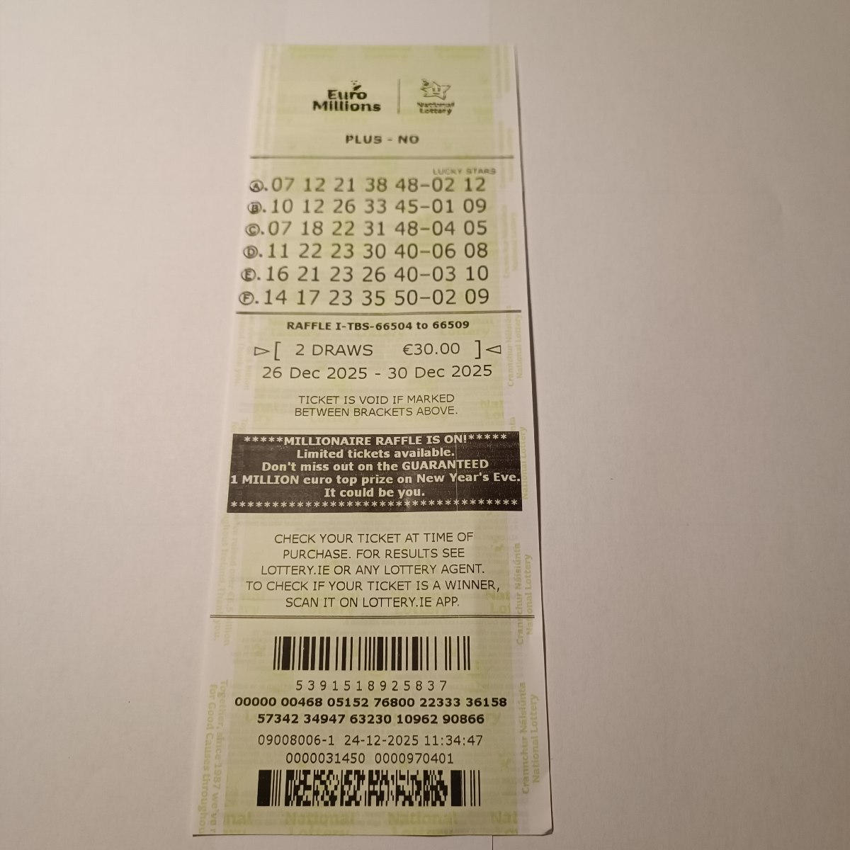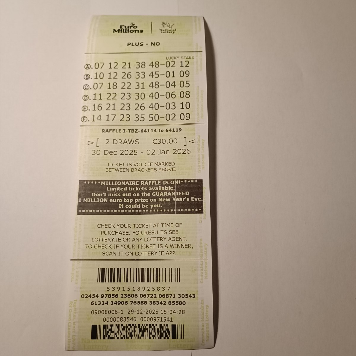 Euromillion Syndicate DP2 draw 30Dec25 cupons: