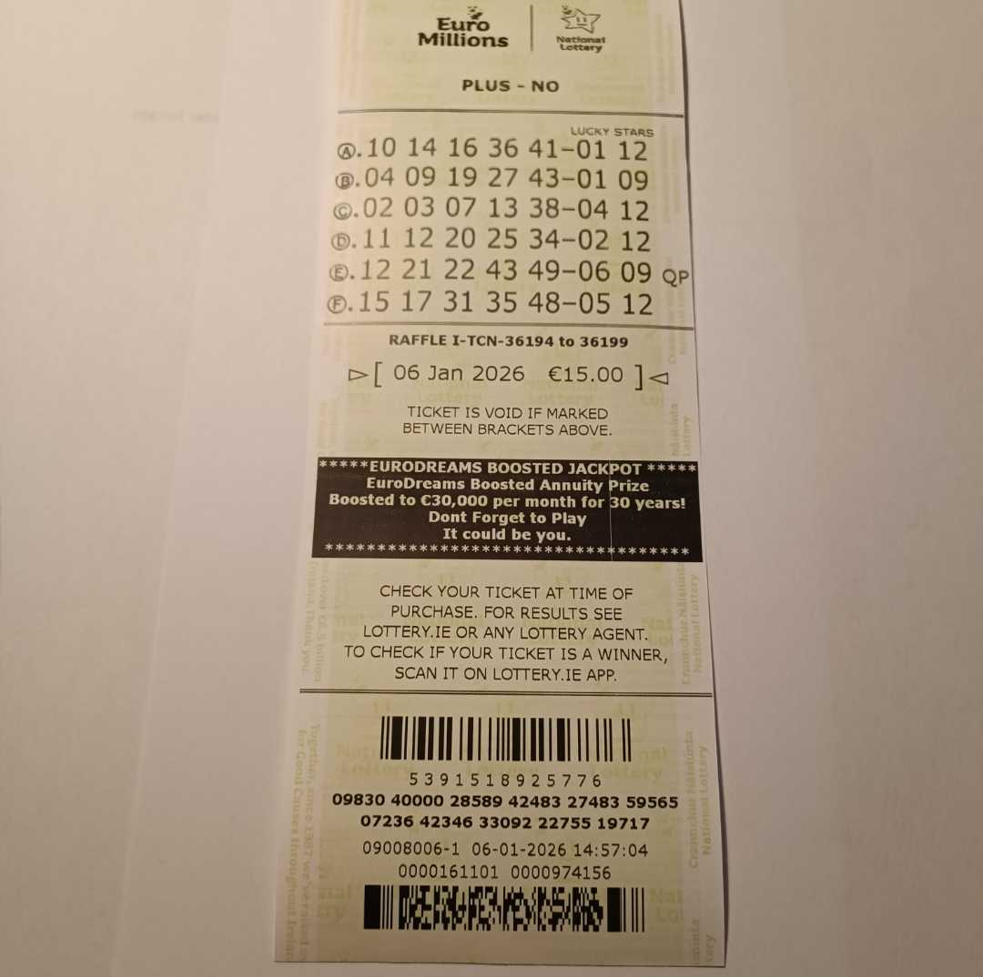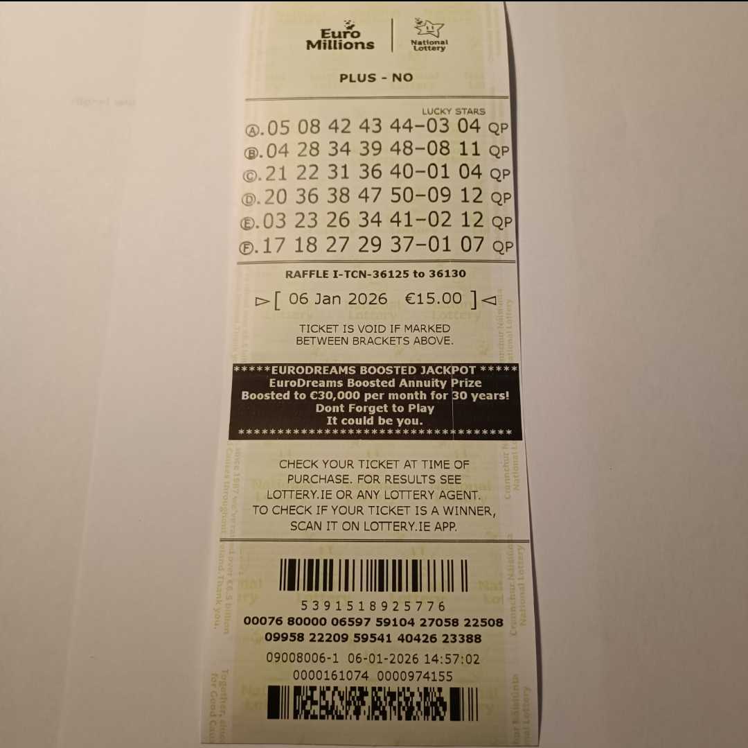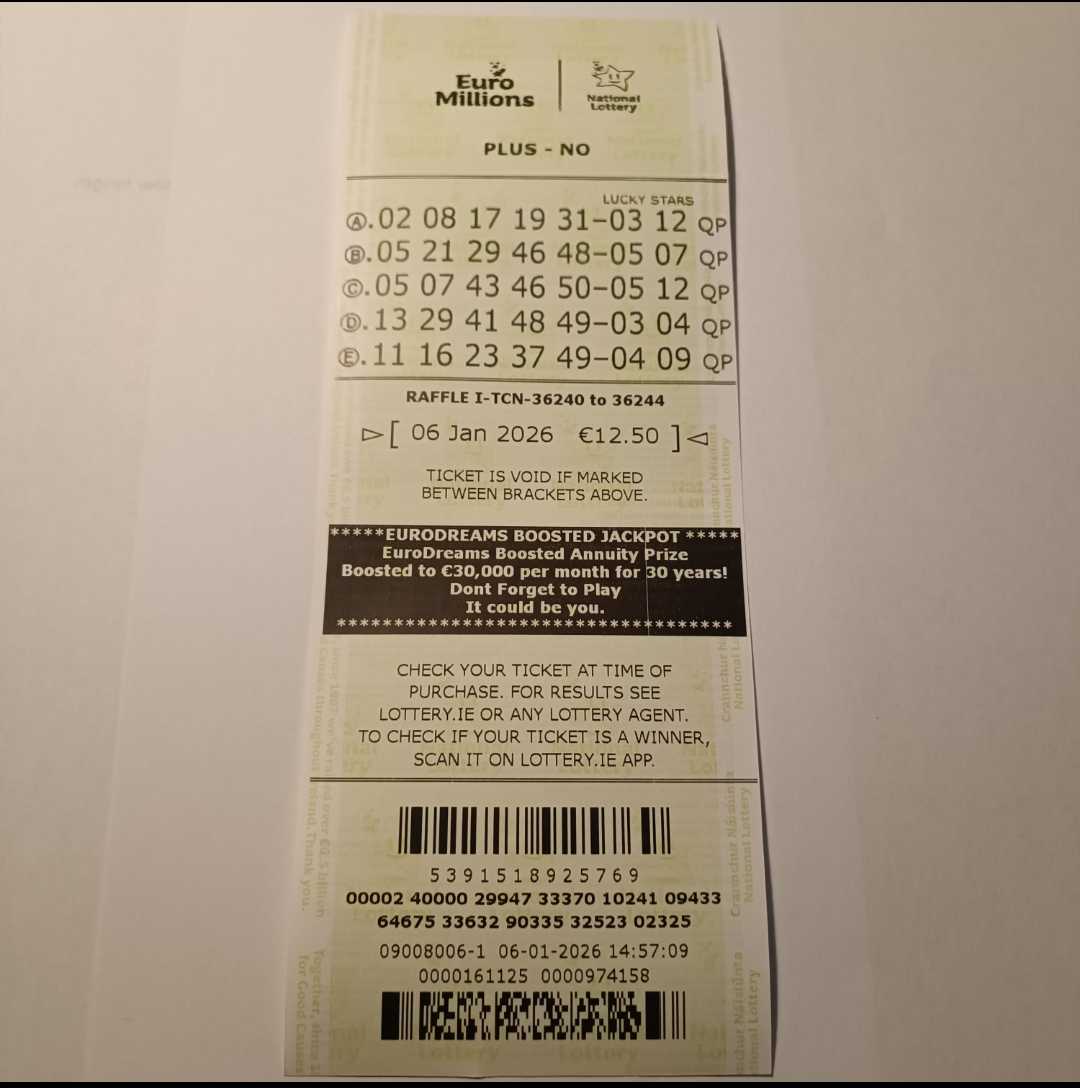 We play Euromillions every Tuesday. Please send me the money before Monday as I need time to physically send the tickets to the shop. If you haven’t paid, you don’t play.