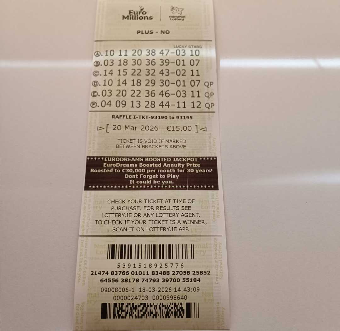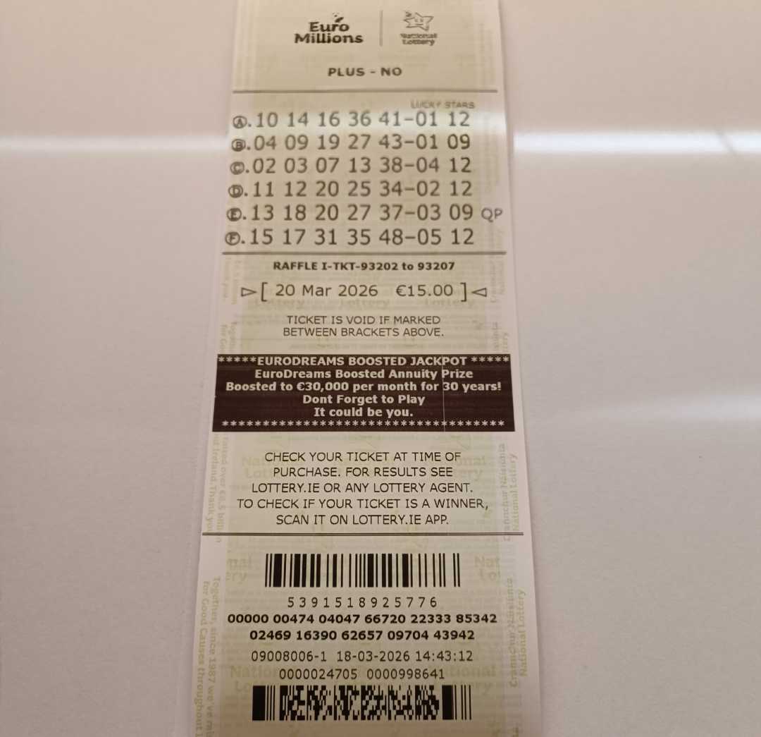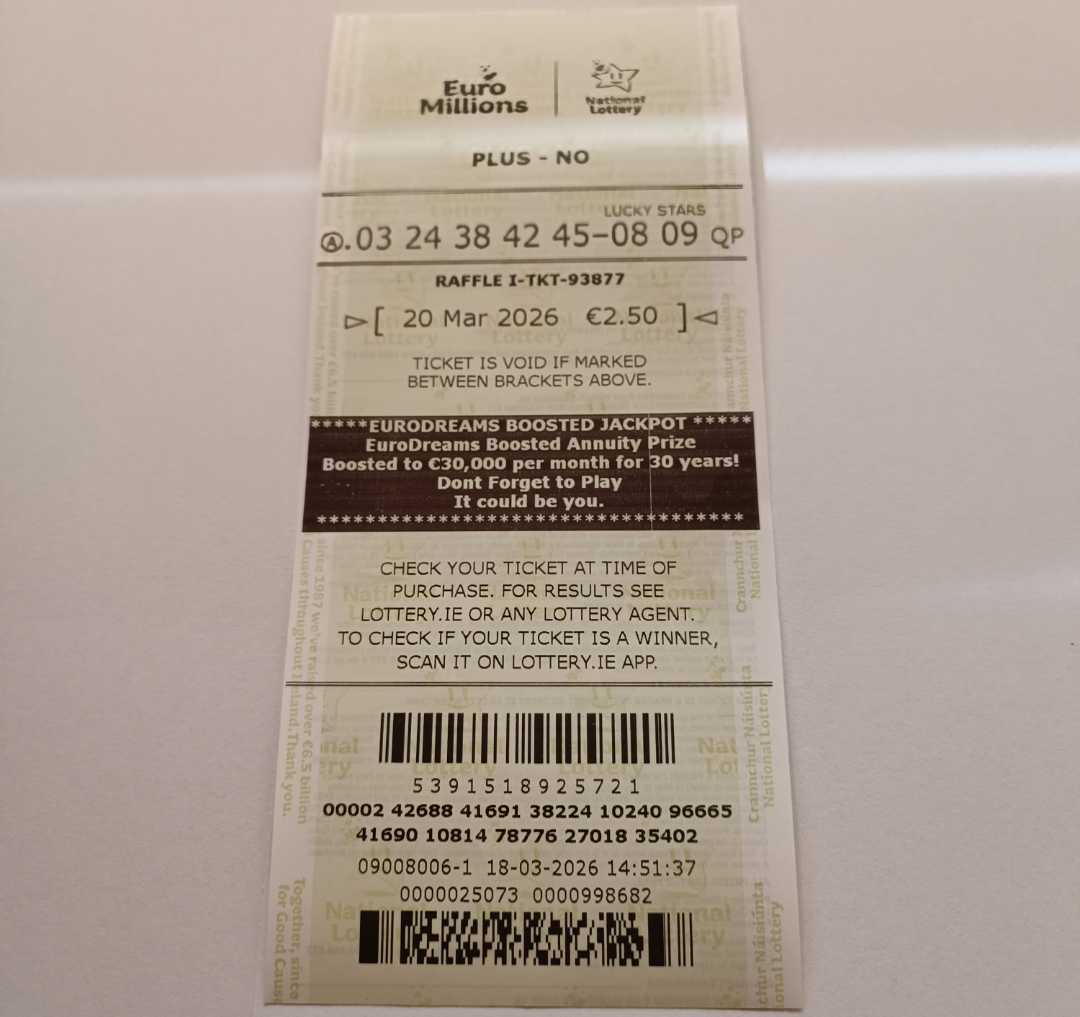 We play Euromillions every Tuesday. Please send me the money before Monday as I need time to physically send the tickets to the shop. If you haven’t paid, you don’t play.