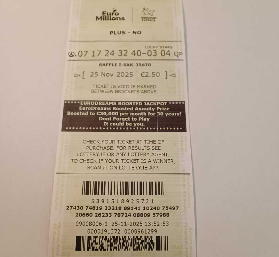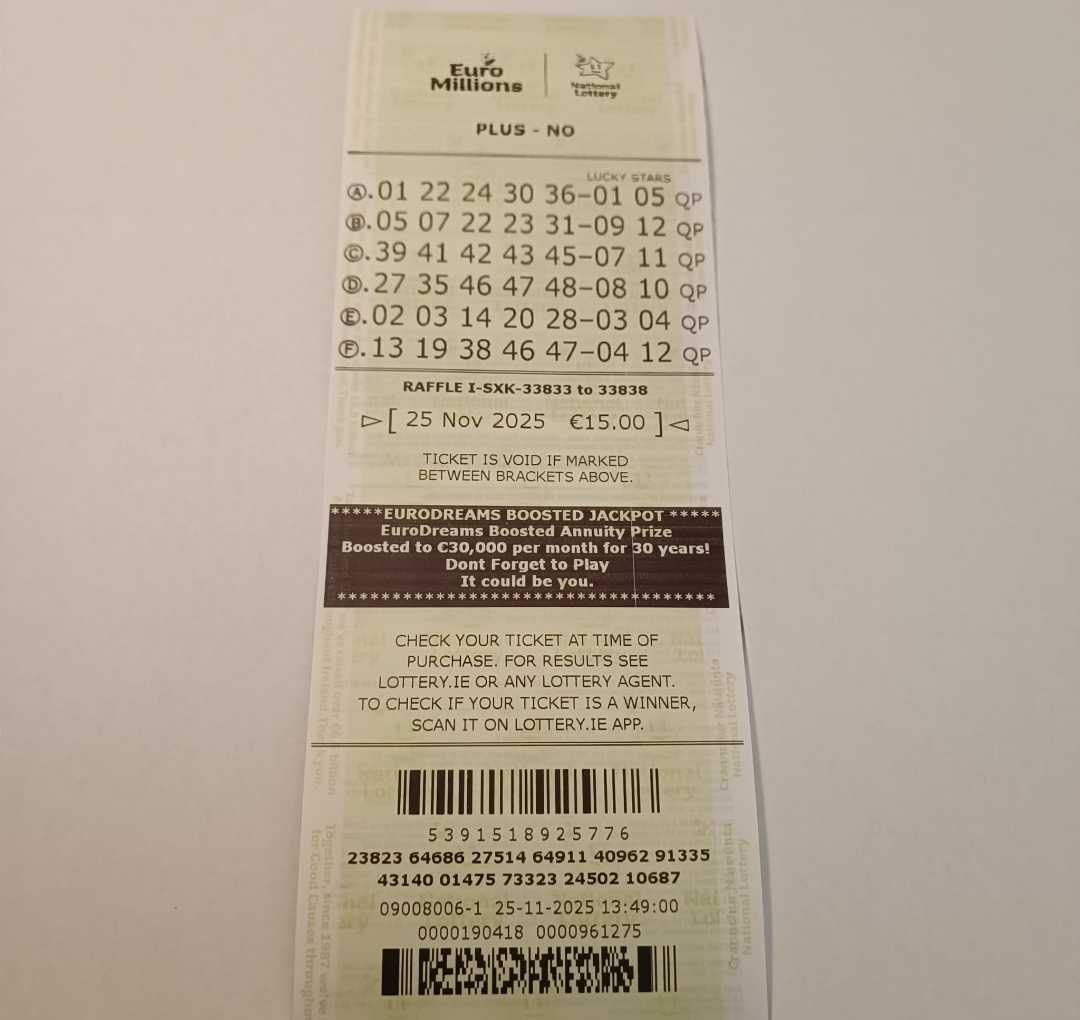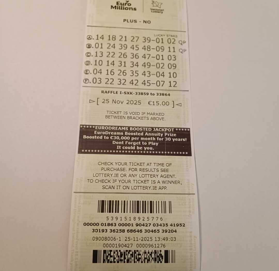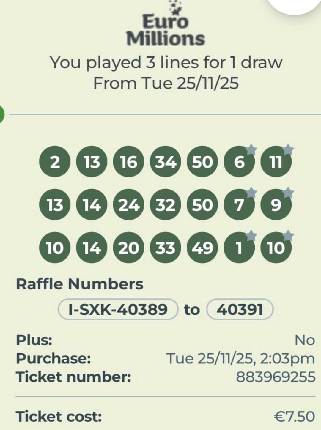 We play Euromillions every Tuesday. Please send me the money before Monday as I need time to physically send the tickets to the shop. If you haven’t paid, you don’t play.