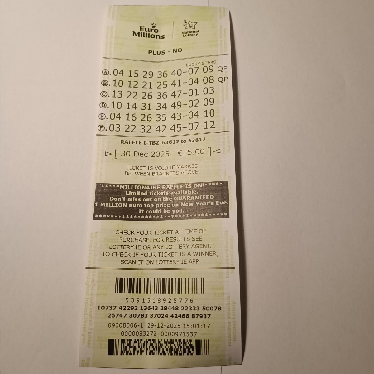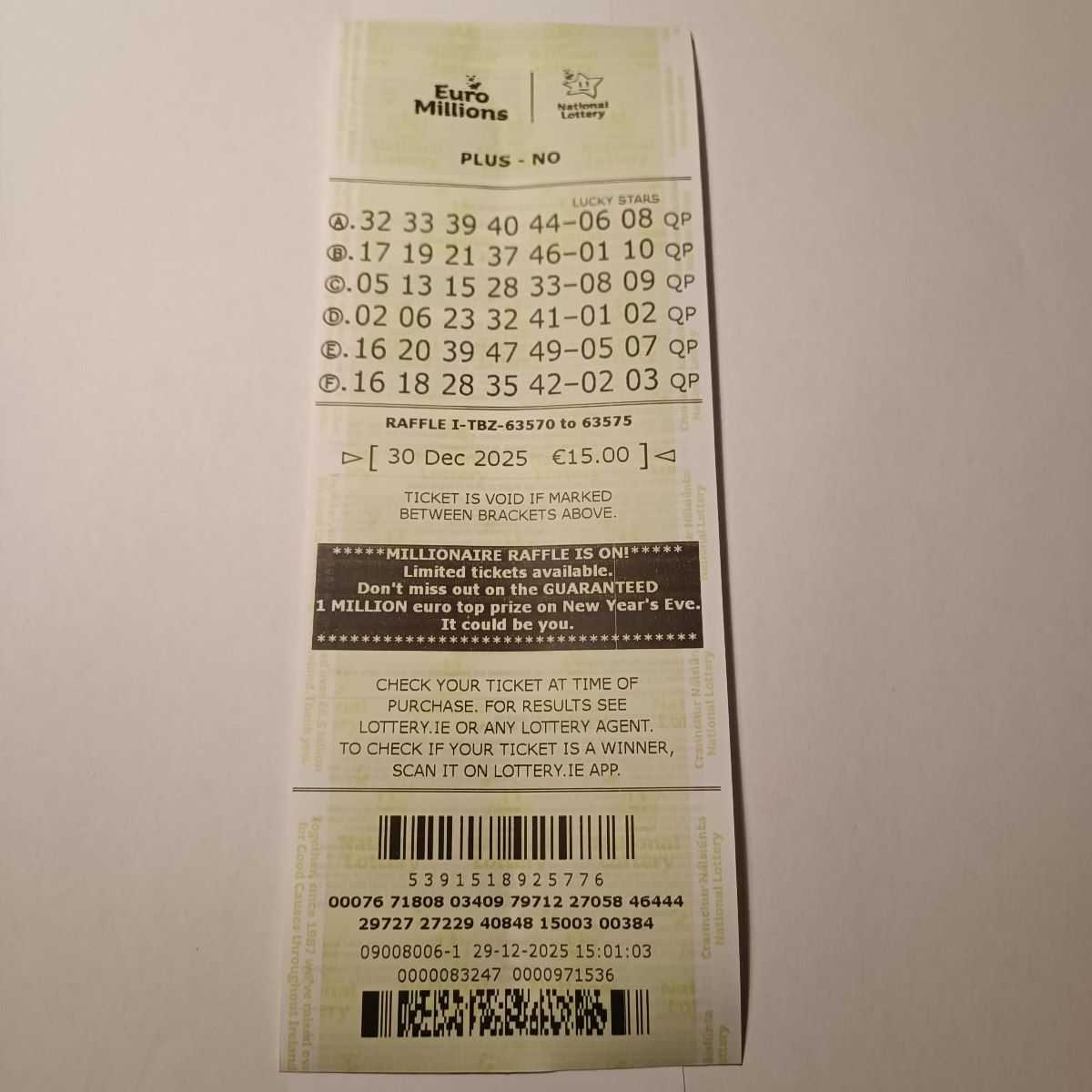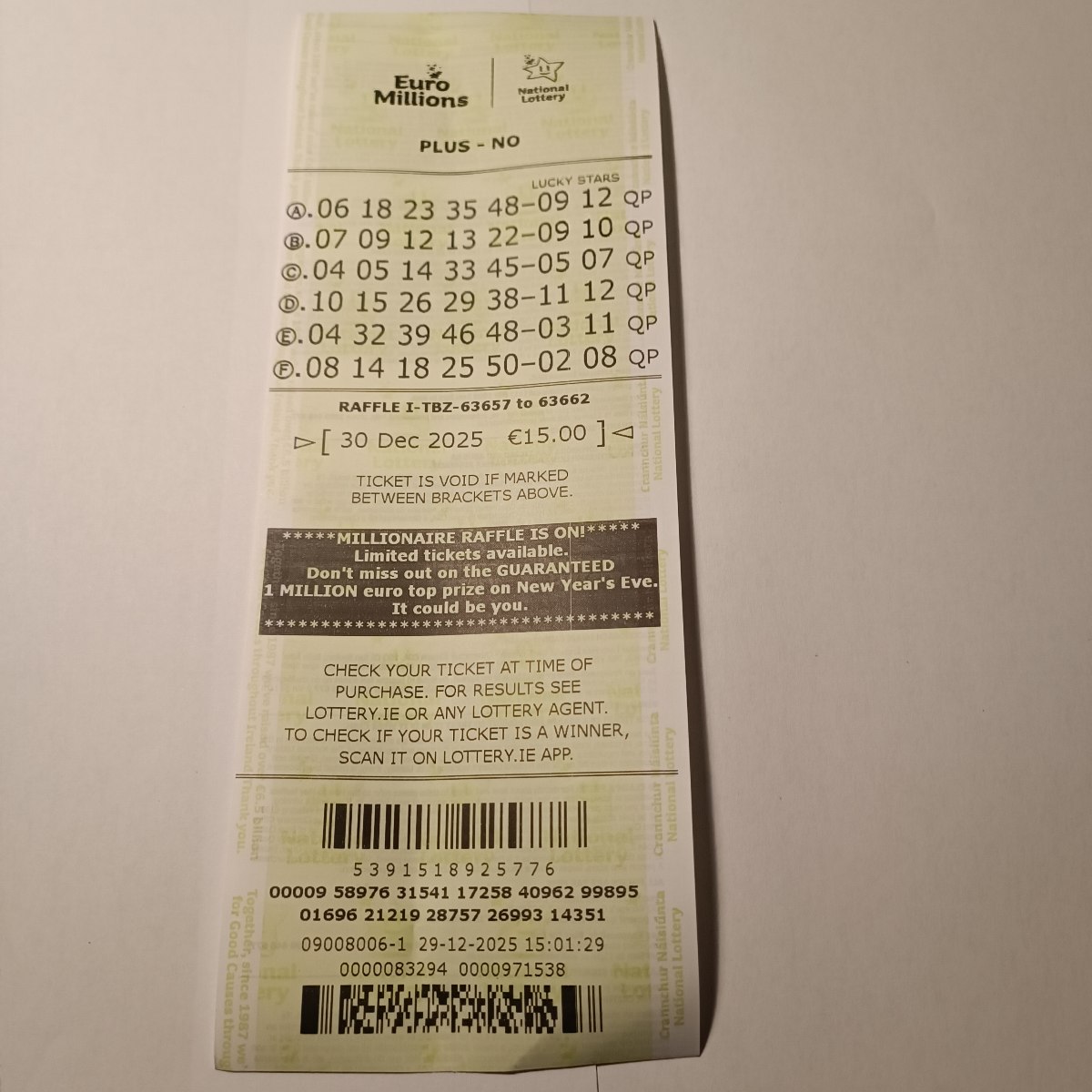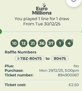 We play Euromillions every Tuesday. Please send me the money before Monday as I need time to physically send the tickets to the shop. If you haven’t paid, you don’t play.