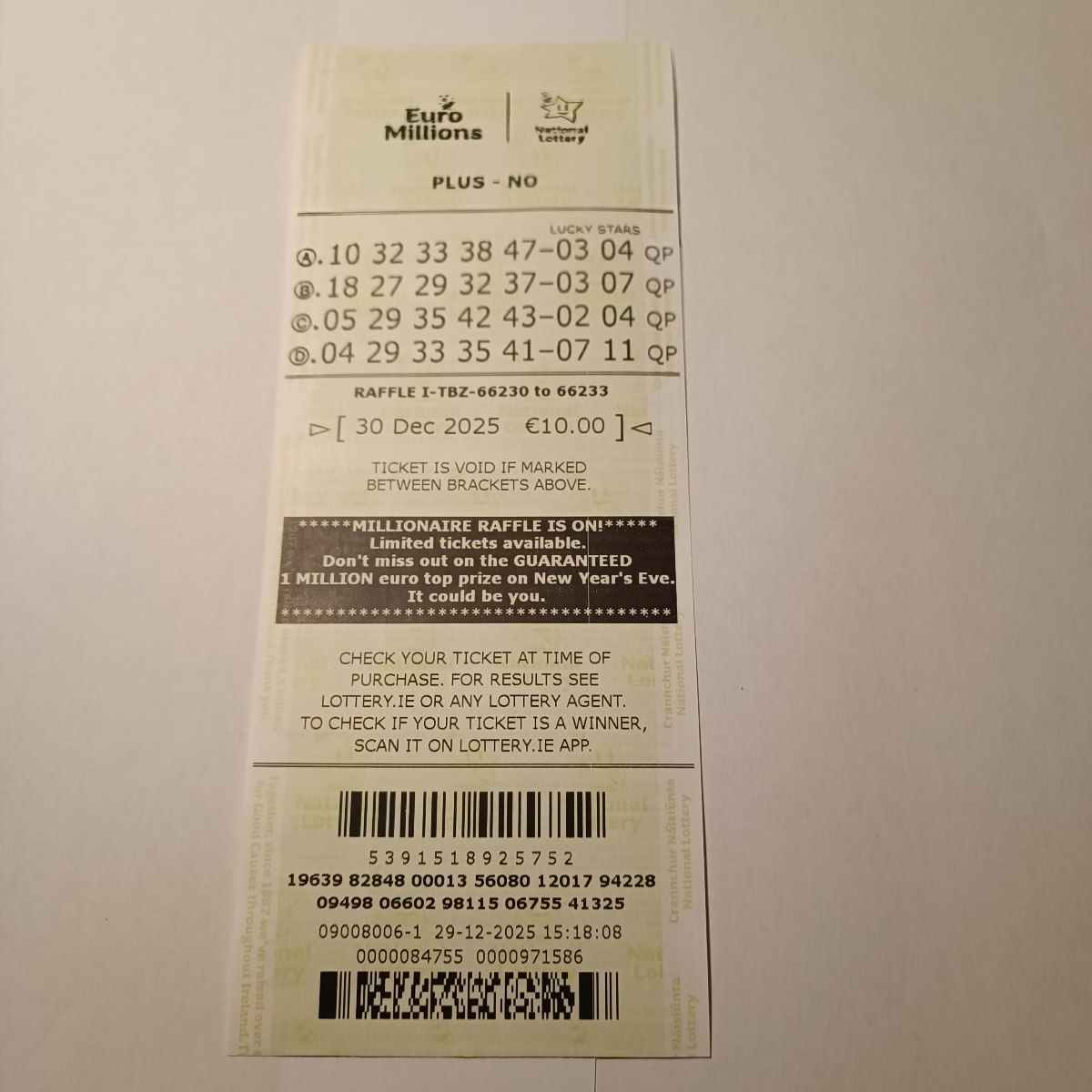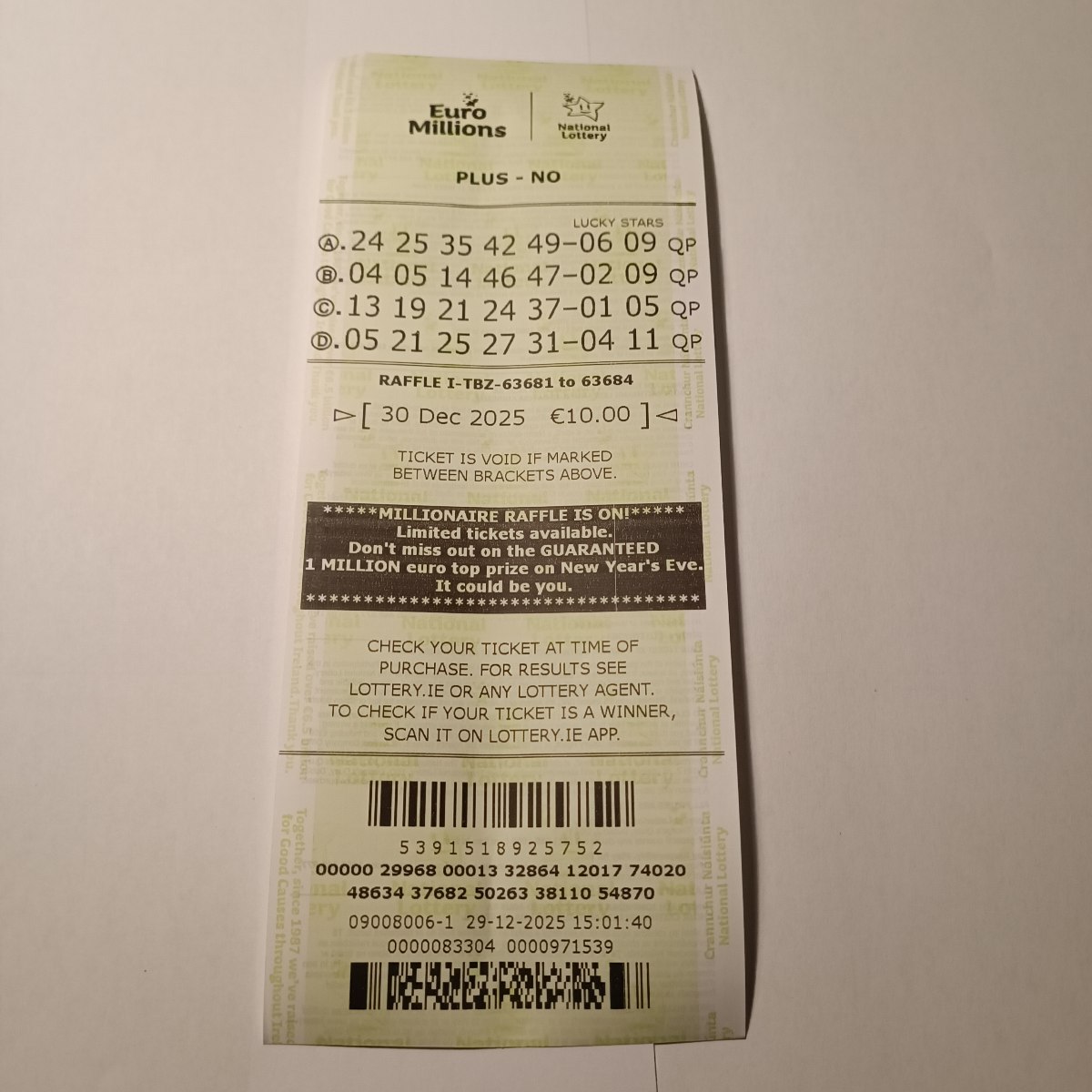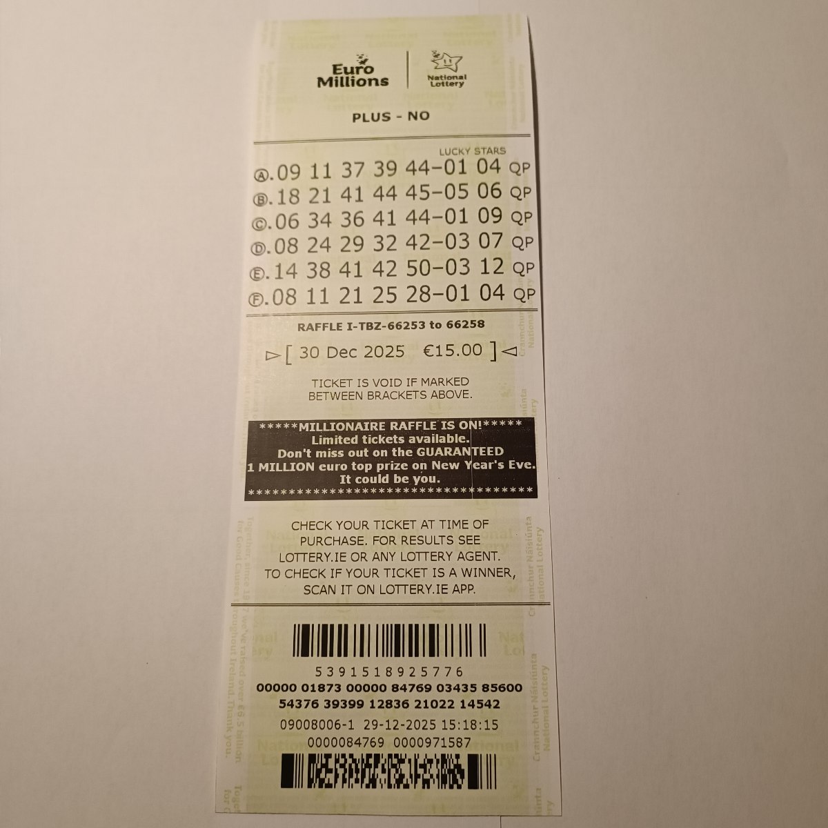 We play Euromillions every Tuesday. Please send me the money before Monday as I need time to physically send the tickets to the shop. If you haven’t paid, you don’t play.