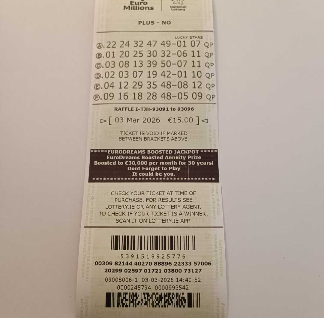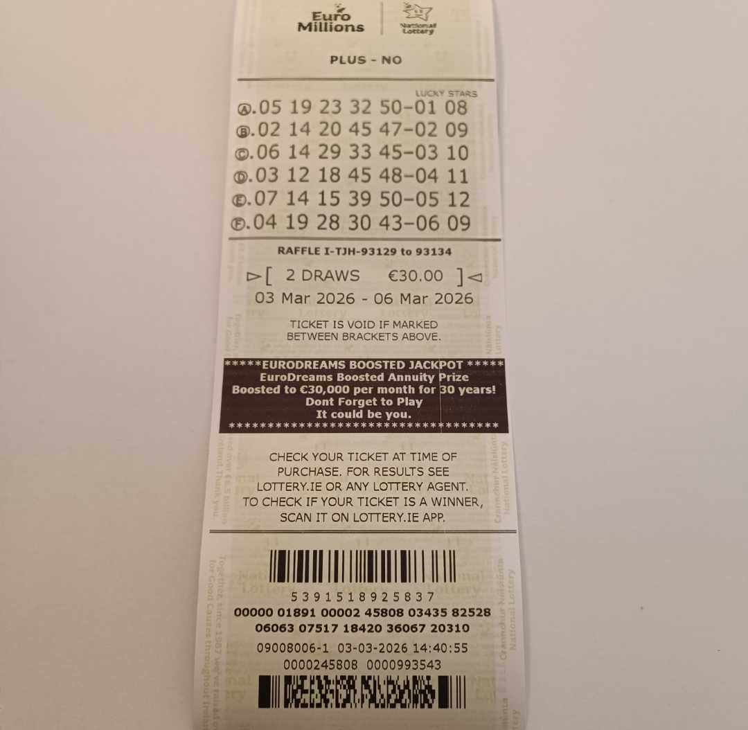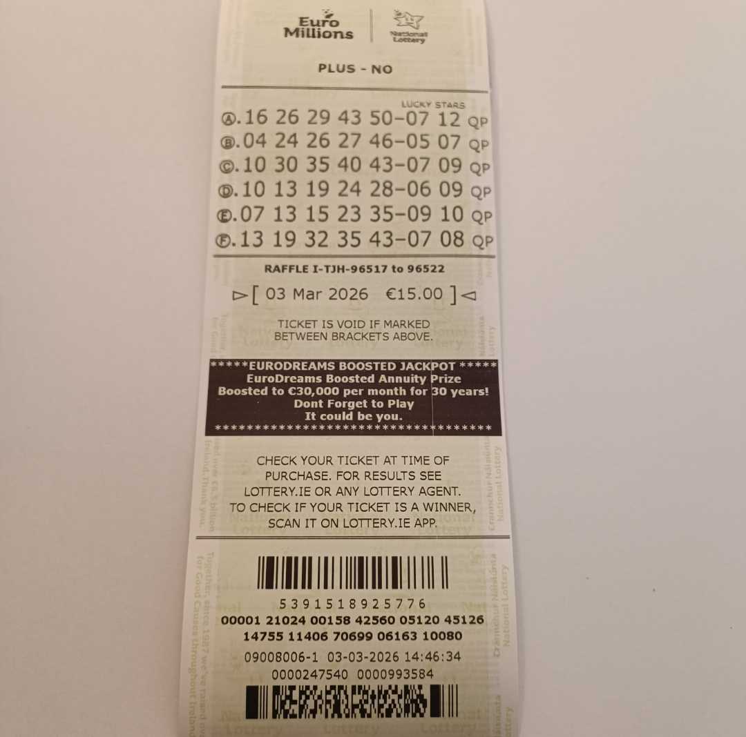 We play Euromillions every Tuesday. Please send me the money before Thursday as I need time to physically send the tickets to the shop. If you haven’t paid, you don’t play.