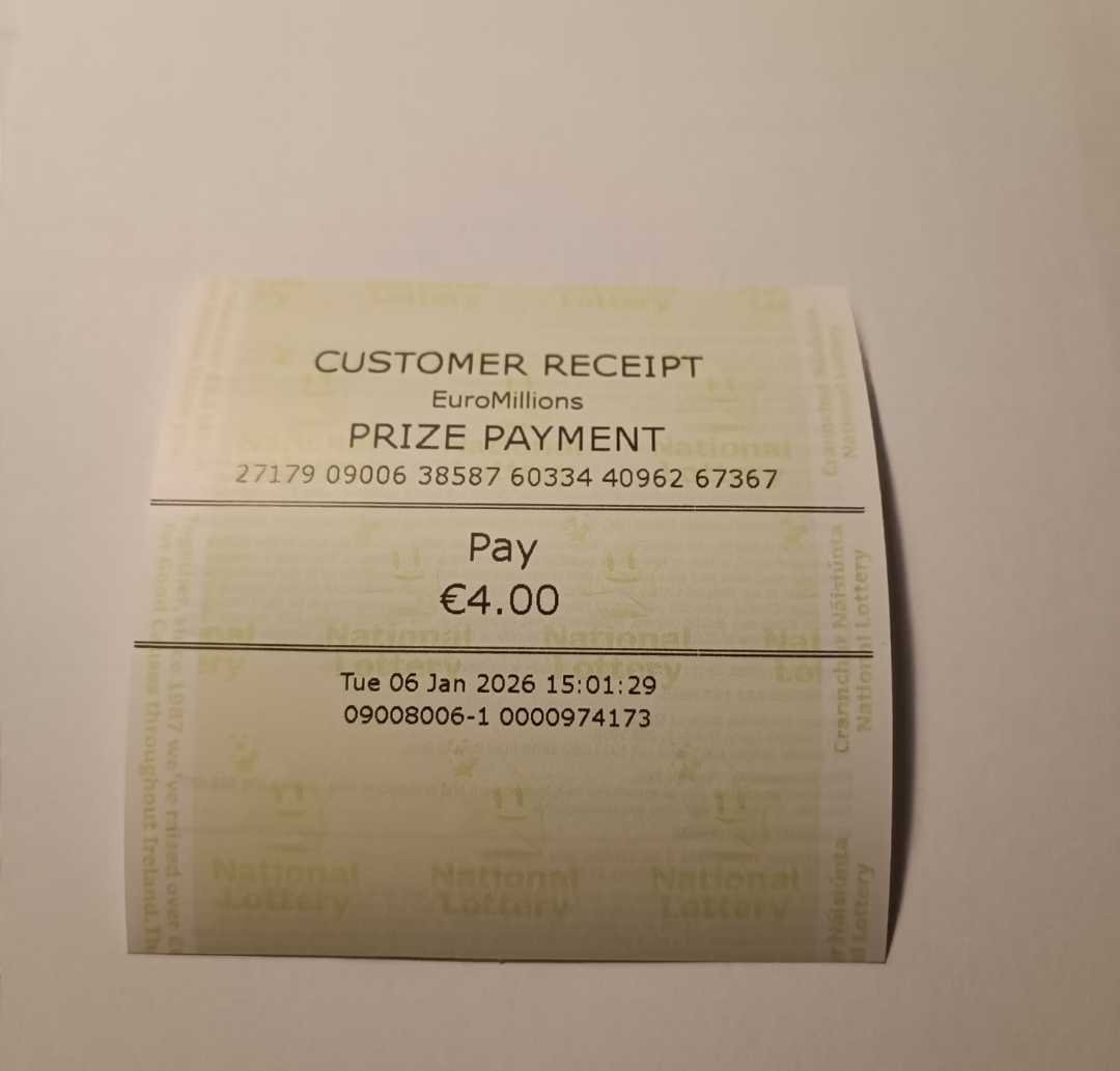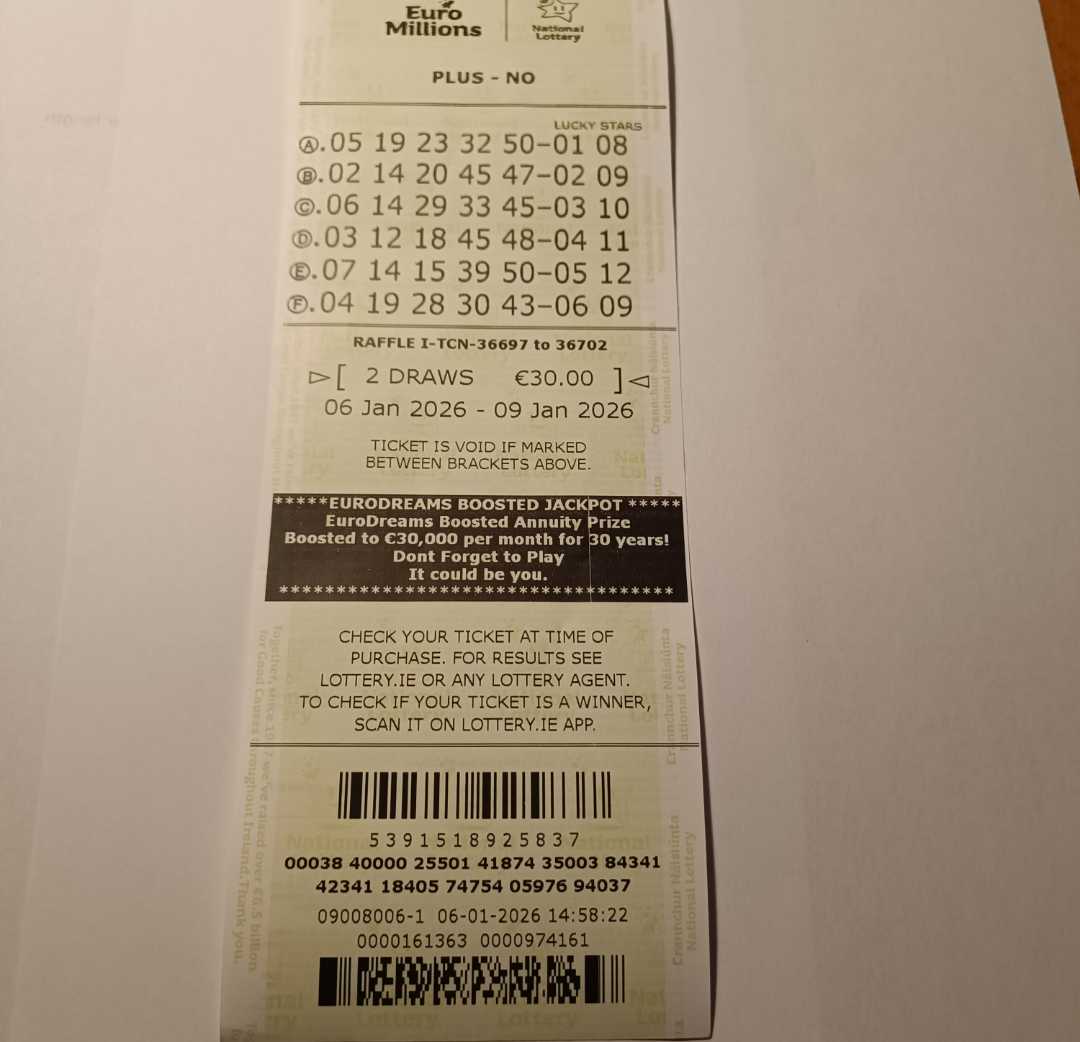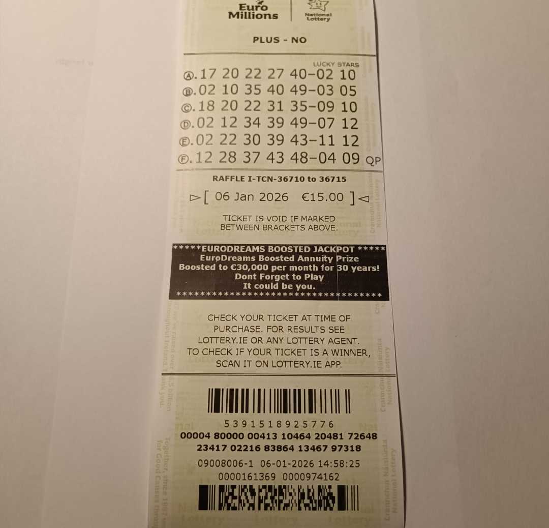 We play Euromillions every Tuesday. Please send me the money before Thursday as I need time to physically send the tickets to the shop. If you haven’t paid, you don’t play.