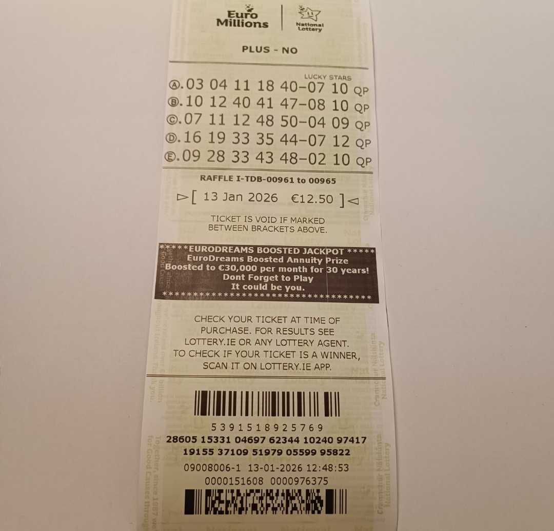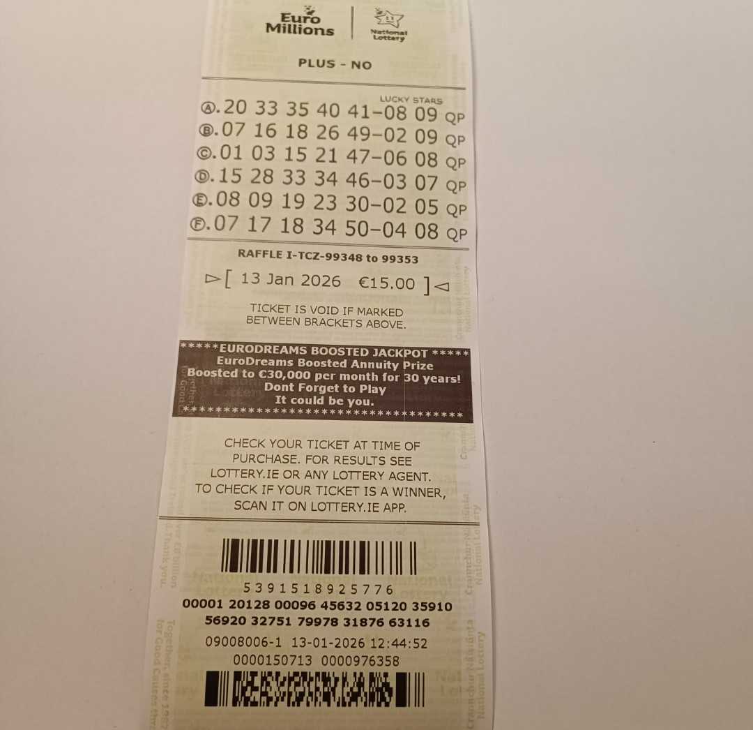 We play Euromillions every Tuesday. Please send me the money before Thursday as I need time to physically send the tickets to the shop. If you haven’t paid, you don’t play.